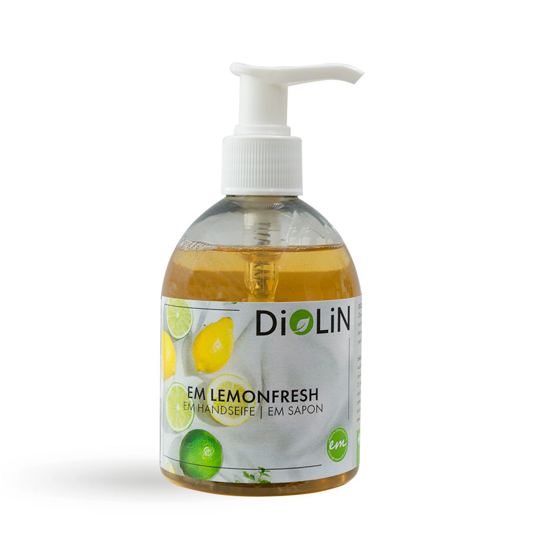 Die DiOLiN EM Flüssigseife Lemonfresh ist eine flüssige Seife mit starker und hautschonender Reinigungswirkung. Der frische Zitronenduft belebt den Geist und stimuliert die Sinne. Der hohe Gehalt an Glyzerin gibt der Haut ein erfrischendes Wohlgefühl.